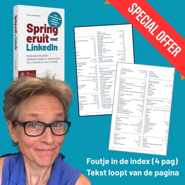 Oeps… een klein schoonheidsfoutje! In de kersverse 5e druk van Spring eruit met LinkedIn is de index helaas van de pagina gelopen. Slordig? Een beetje. Erg voor de inhoud? Totaal niet! Omdat ik wil dat je razendsnel de juiste info vindt, ontvang je bij dit boek een losse, correcte index-bijlage. Zoek je liever digitaal? Je krijgt de PDF van de index er ook gewoon bij.